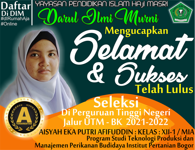 Kami Yayasan Pendidikan Islam Haji Masri melalui unit SMA Swasta Darul Ilmi Murni mengkonfirmasi Alumni Siswi SMA kami atas nama : AISYAH EKA PUTRI AFIFUDDINKELAS : XII-1 / MIALulus di Tiga Universitas Sekaligus ( USU, UINSU dan IPB ) & memilih melanjutkan Pendidikan ke Program Studi Teknologi Produksi dan Manajemen Perikanan Budidaya Institut Pertanian BogorSemoga Ilmu yang didapat bermanfaat, Semoga menjadi orang yang berguna bagi Agama, Nusa dan Bangsa. Tunggu apa lagi !!Ayo Segera Daftarkan Diri Anda !!